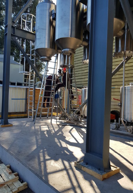 Instalación de, válvulas, manómetros, visores, instrumentos de medición, etc. Se fabricaron circuitos de : línea agua, línea de aire comprimido, Línea de alimentación y retorno lavado CIP, línea jugo concentrado, línea condensado, línea de pulpa, línea de jugo crudo, línea jugo filtrado, línea de enfriamiento (glicol), mas suportación de pipin. línea de agua, línea de pulpa, líneas de tratamientos, líneas de jugos pre-concentrado y concentrados, líneas de lavado CIP, líneas de condensado, línea de jugo crudo, línea jugo filtrado.